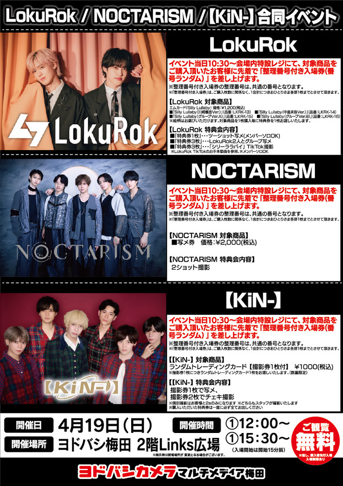 ※「整理番号付き入場券」をお持ちのお客様は、イベント開始15分前に、イベントスペースへお越し下さい。番号順にご入場頂きます。